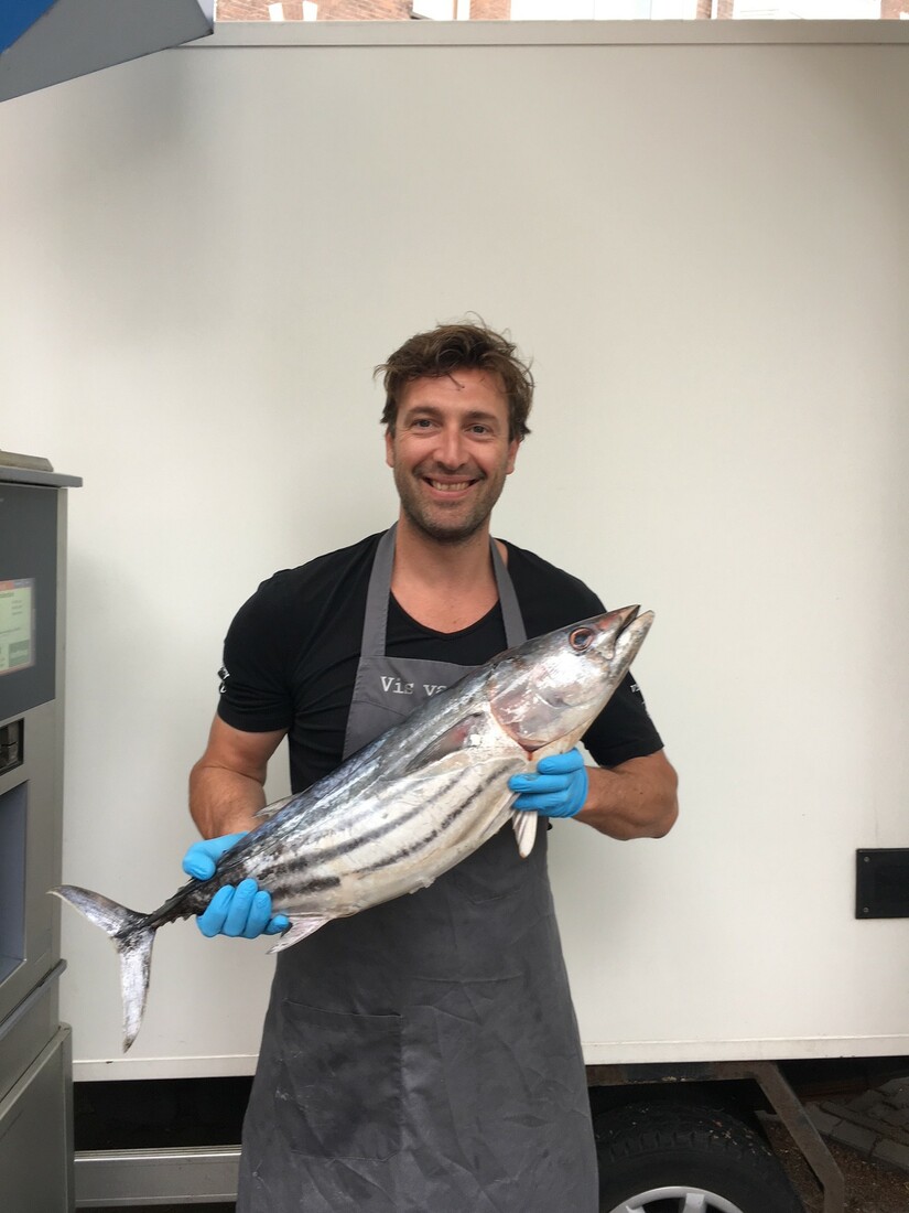 Voor haring alleen hoef je trouwens niet per se langs te komen. Of in ieder geval, neem dan ook wat anders mee! Want ondanks zijn begin in de viswereld, heeft hij het niet zo op die vette vis. “Waarom is daar nou elk jaar weer een hele campagne voor? Het is best een lekker visje hoor, maar de schar verdient ook vlaggen, vind ik. Of de zeebaars! Laten we zorgen dat mensen die een bepaalde periode volop vieren. En dat ze naar de visboer gaan omdat die zo goed alle vissen kan fileren en niet alleen maar die eindeloze haring.” Hij stuurt mensen wel met liefde door naar de haringkar, waar ze daar echt in gespecialiseerd zijn. Want dat ambacht heeft hij heus wel hoog zitten. Maar de visboer, die doet in álle vis. Komende wintermaanden is die zeebaars zijn eigen favoriet. En ook de makrelen en platvissen zijn nog hartstikke mooi.