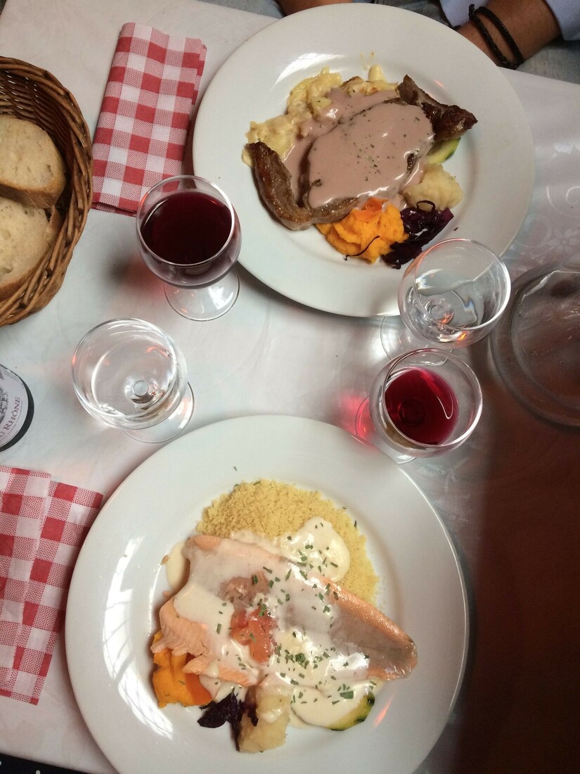 Madame staat in de keuken achter de pannen en haar vriendelijke echtgenoot neemt de bediening voor zijn rekening. Wij kozen voor een voor- en hoofdgerecht, maar een hoofdgerecht en dessert mag natuurlijk ook. Vooraf aten we een zware doch heerlijke soufflé van peer met gorgonzola en een flink stuk pâthé de campagne met stokbrood. Als hoofdgerecht lamskoteletjes met rodewijnsaus, heerlijke groentegarnituur en verrukkelijke aardappelgratin en forel met beurre blanc, couscous en grapefruit.