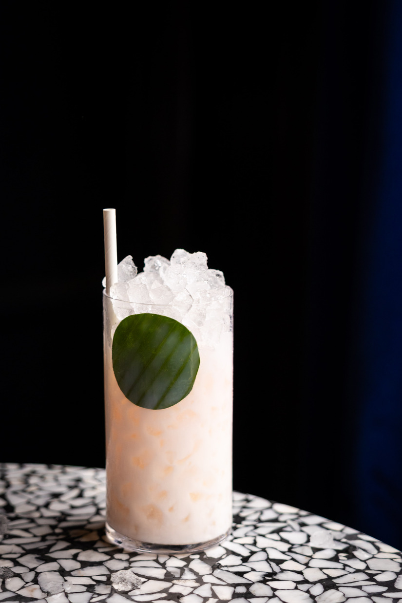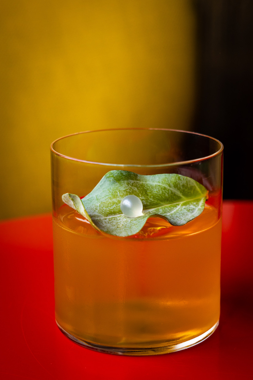 De cocktail Great Fire Swizzle is gemaakt met een blanco tequila, amandel en witte chocolade. Op het eerste oog simpel, maar daarna gaat Super Lyan los met eenlacto-fermentatie van kimchi, yoghurt en peer. We verwachten een glas vol wilde smaken, maar de cocktail is juist toegankelijk, romig en fris.