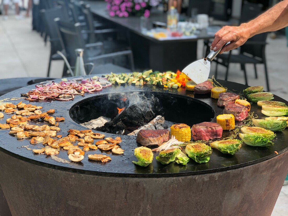 De kolen van zowel de Big Green Egg als de Arteflame worden ontstoken en de echte kennismaking met het lekkere vlees kan beginnen. Het ene na het andere mooie stukje verschijnt dan ook op de barbecue. Grillmaster GertJan van Dijk trapt de middag af en vertelt ons alles over de indrukwekkende Arteflame. Zo vertelt hij bijvoorbeeld over de aflopende gril waardoor het vet altijd langs het vlees loopt wanneer je het vet boven legt en vlees onder. Wanneer hij de daad bij het woord voegt, loopt het water ons in de mond. De Arteflame is ideaal voor als je indruk wil maken op je gasten. Chefs kijken nieuwsgierig op de vingers van de slagers. We krijgen uitleg over het vlees, griltechnieken, Freygaard en Sashi en kunnen niet wachten tot onze trek daadwerkelijk wordt gestild. Laat dat proeven maar beginnen!