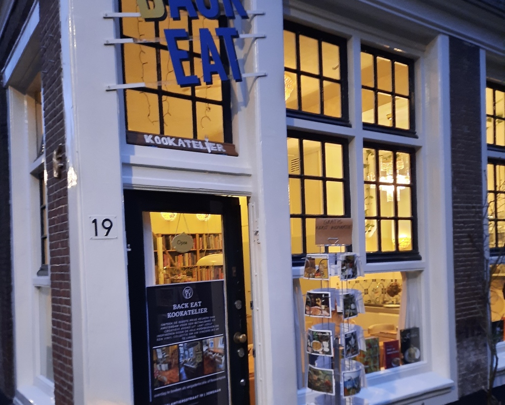Het draait uiteindelijk om het koken bij Back Eat. Dat is direct duidelijk aan de mooie lange eettafel en de keuken, waar niets aan ontbreekt. Eveneens niet te missen: de enorme boekenkast. De boeken vormen meestal de gerechten van de avond.