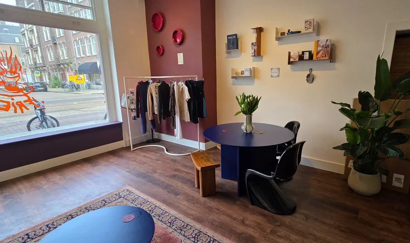 Eigenlijk twee verschillende sferen. Achterin die van een gezellige koffiebar en voorin die van een huiskamer maar dan bij je vriend, de designer.