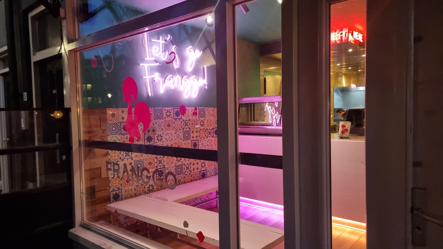In deze nieuwe lichte zaak hangt een heerlijke sfeer met lekker dicht op elkaar staande tafeltjes en uitbundige neon.