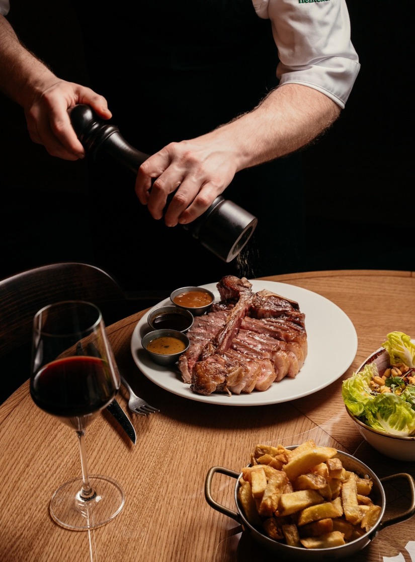 Een chique steakhouse met premiumvlees van dry aged tot Wagyu met Latijns Amerikaanse bijgerechten.
