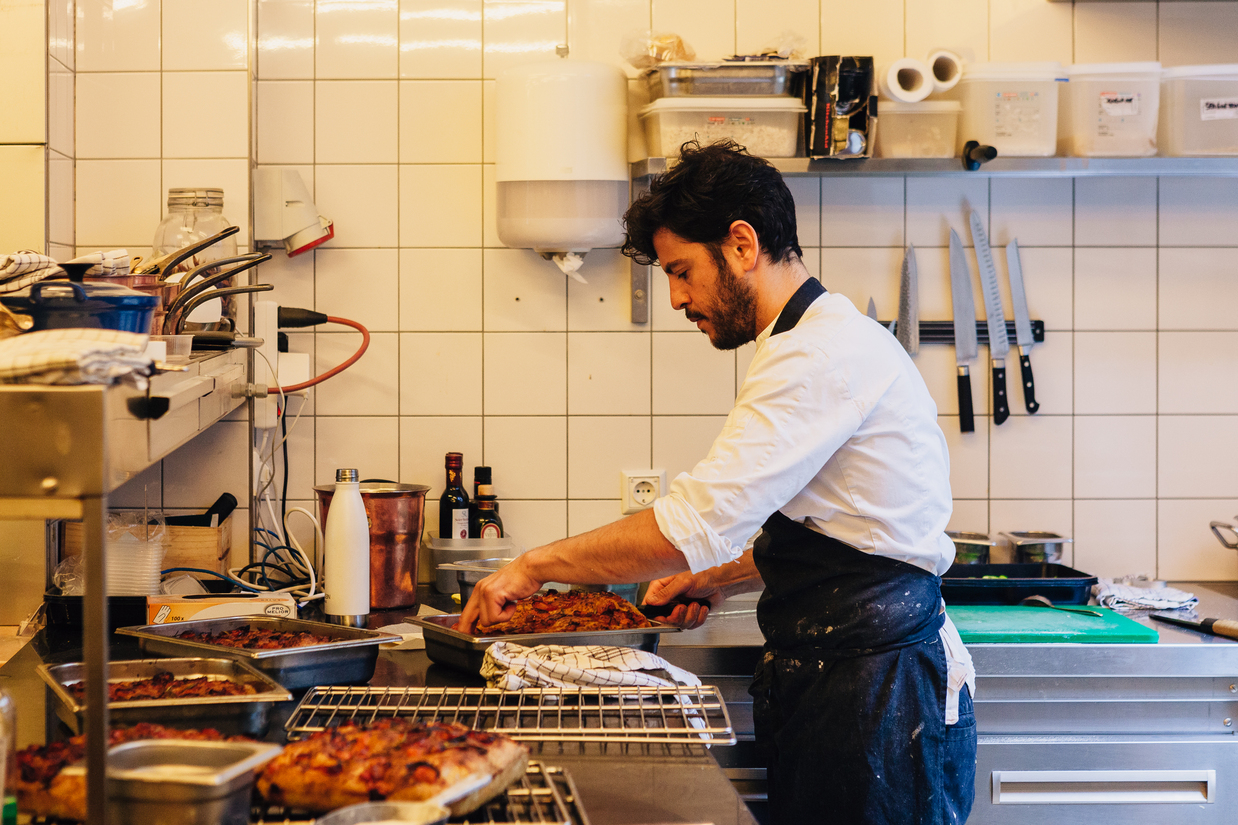 Flavio Ghignoni Carestia, chef en mede-eigenaar van Restaurant Domenica op de Noordermarkt, zit niet bij de pakken neer tijdens de lockdown. Hij houdt zichzelf en zijn personeel bezig met onder meer chef aan huis zijn en deegwaren – zoals pasta, brood en pizza – maken met zijn goede vriend en chef Stefano Orofino. Ook is hij bezig met nieuwe ideeën voor het restaurant.