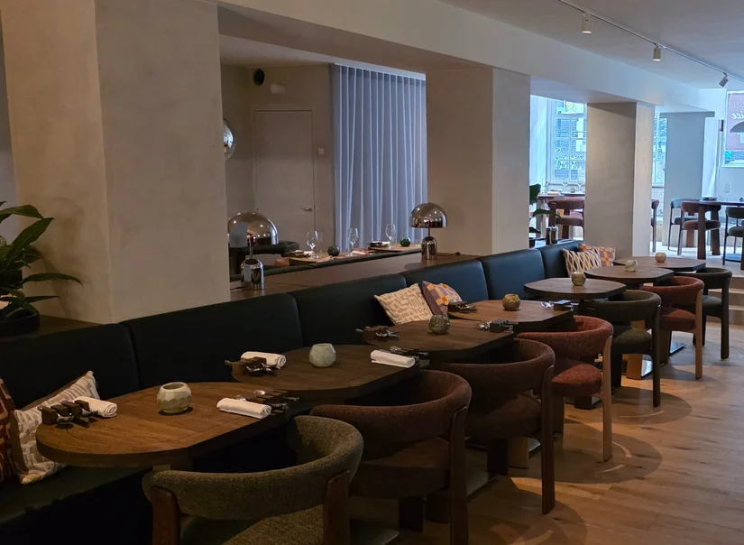 De inrichting is van de hand van het vermaande Concrete, waarbij er veel sfeer en licht in de donkere pijpenlade van het oude Sukhothai Thanee in de Noorderstraat is gestopt. Een lange gang met sfeervolle gordijnen doet je vermoeden dat je een huis binnenloopt. Aan het einde wacht de bar, waar je een drankje kunt doen om vervolgens het restaurant te betreden. Links is de keuken met vier te gekke plekken aan de pass. Het restaurantdeel is intiem gestyled met groene en bruine tinten en de uitgekiende verlichting maakt het nog sfeervoller. Een leuk detail is de kleine inloop-wijnkamer waar gasten hun eigen wijn kunnen uitzoeken.