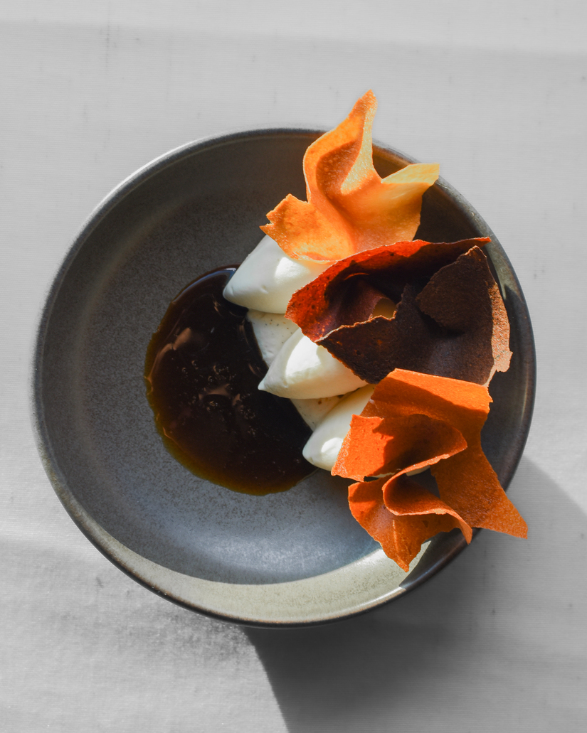 Brian Luikel, de chefkok restaurant Neder in Alkmaar, is een fervent aanhanger van alles wat uit Nederland komt, biologisch, zo lokaal mogelijk en als het even kan van zelfpluk. In zijn menu, waarvan het thema vier maal per jaar wisselt, heeft hij altijd een dessert met groente. In zijn menu ‘Zee & Duin’ staat als dessert zeewier en knolselderij-ijs met zwarte tulp en een karamel met eekhoorntjesbrood op de kaart. ‘Groente en paddenstoelen brengen de nodige umami in een dessert en tillen het gerecht vaak naar een hoger niveau. Bovendien zijn seizoensgroenten veel betaalbaarder. Sommige groenten hebben veel zetmeel en dat is weer perfect voor het opbouwen van een mooie ijsstructuur zoals de knolselderij van dit dessert. Dat is bovendien aards met een anijsachtige smaak, erg mooi voor gebruik in ijs. Daarbij maken een karamel met wat suiker en eekhoorntjesbrood om zoetheid toe te voegen.’ Gasten zijn vaak verrast door het dessert. ‘Ze hebben geen idee wat ze moeten verwachten’, stelt Luikel.’ Ik zeg dan ook vaak geen ‘eet smakelijk’ maar ‘succes’. Het is fijn dat ons dessert ze een beetje uit hun comfortzone haalt, die ervaring zullen ze zeker niet vergeten. Zolang het moet altijd wel is, dat is een randvoorwaarde. Voor het komende stadsmenu werken we nu aan een omgevallen softijsje van zevenblad en morielje.’