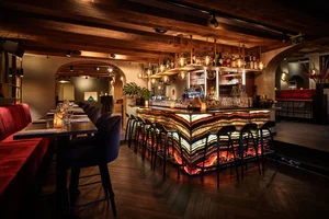 De bouwstijl van het monument aan de Rokin typeert zich als Hollands Classicisme. Het was voorheen een handelsgebouw. Als je binnenkomt waan je je in een kleurrijke ruimte. Het interieur is erg hip, eigentijds en de kleuren zijn sprankelend. Het pand heeft twee verdiepingen. Toch zie je beneden het oude handelsgebouw goed terugkomen en dragen de houten balken de lage plafonds. "We hebben beneden een deel van het pand in tact gelaten", vertelt Fardau. Het oude monument en de eigentijdse inrichting zitten mooi in elkaar verweven. Beneden valt je oog gelijk op de marmeren verlichten bar. De sfeer is intiem en gezellig.