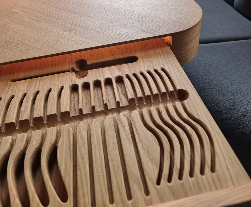 Naast de indeling van het restaurant is ook het interieur helemaal vernieuwd, net zoals bij de originele versie door designbureau Concrete met warme kastanje tinten, veel hout en glas waardoor er nog steeds zicht is op de open keuken.’Uiteindelijk duurde de verbouwing wel veel langer dan verwacht door extra lange levertijden van sommige materialen. In de nieuwe inrichting is geen plaats meer voor onze kenmerkende eetbar, de was echt te krap voor onze plannen. De barkrukken aan het raam hebben nu plaatsgemaakt voor comfortabele halfronde banken met de rug tegen de ramen. Vier banken voor twee personen en twee voor vier, die nu allemaal direct zicht hebben op onze open keuken.’ De slimme laden bij 212 zijn gebleven en bevinden zich nu aan de voorzijde van de tafels in een kastje voor opbergen van bestek, glaswerk en servetten. Ook de voorbereidingskeuken beneden en de wijnkelder zijn aangepakt en in dezelfde stijl vormgegeven. ‘Daar gaan we voorlopig geen activiteiten ontplooien’, vertelt hij. ‘We richten alle aandacht op de gasten boven.’