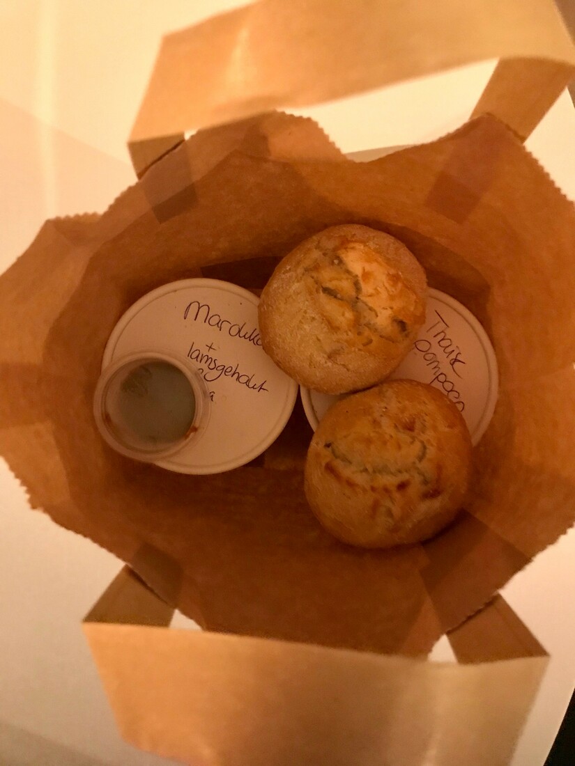 Na ons bezoek aan Trev’s soep volgt een borrel met vrienden. Vrienden die goede borrelhapjes verzorgen, zijn toch wel echt de leukste vrienden. Maar goed, een avondmaaltijd overslaan is natuurlijk geen optie. En zo kwamen we op de terugweg weer bij Trev’s soep terecht. Dit keer om twee soepen mee naar huis te nemen. En dan kun je er natuurlijk net zo goed een heerlijke dikke plak zelfgebakken bosbessen-cake bij bestellen. Als toetje. Een hele goede reden om de Albert Heijn aan de overkant over te slaan en bij Trev en Eva langs te gaan. Dit keer proberen we de Thaise pompoensoep met bosui en de Marokkaanse soep met optioneel (dus ja) Harissa en lamsgehaktballetjes. Vooral de laatste is geweldig, dus laten we hopen dat die snel nog een keer terugkeert op het menu.