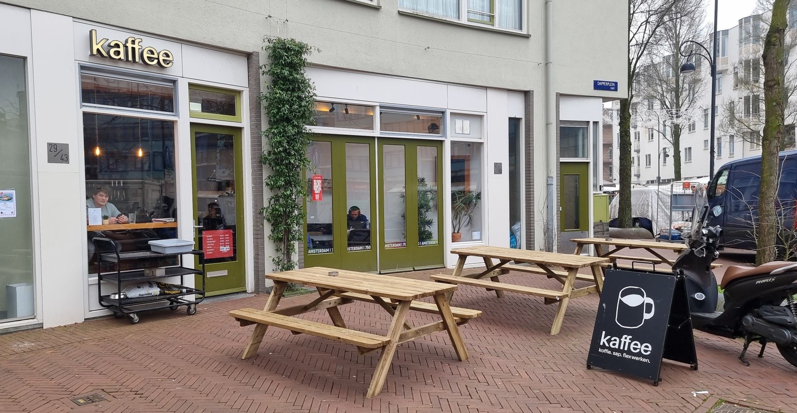 Midden op de Dappermarkt vind je Kaffee. Met koffie van Rum Baba, klein terrasje voor de deur, leuke lunch en fijne cake.