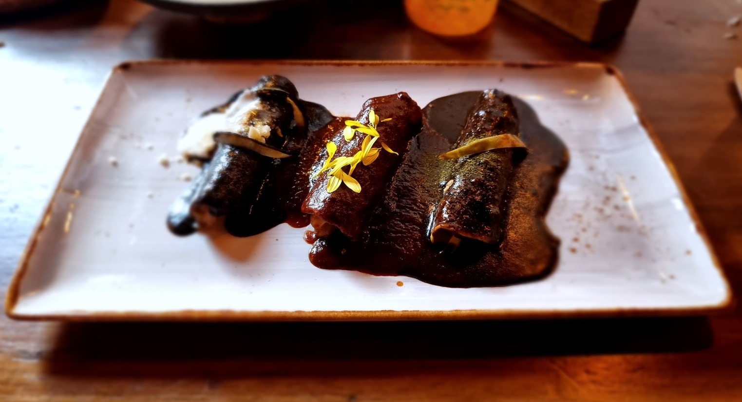 Donderdag 31 oktober is het weer Halloween en 2 november is de Mexicaanse variant in de vorm van ‘Dia de los Muertos’ oftewel ‘de dag van de doden’. Speciaal voor die dag maakt Joan, de chef van Oaxaca, zijn gerecht voor El Dia de los Muertos. In dit geval drie enchiladas als symboliek naar de manier waarop de traditionele begrafenissen in Mexico zijn. Waarbij het lijk in een doek met bladeren wordt gewikkeld. De enchiladas hebben allemaal dezelfde vulling van vlees, noten en vruchten maar verschillen van elkaar door de mole-saus. Die complexe saus, van soms wel 35 ingrediënten, wisselt van licht zoetig met geroosterde ui en een touch van cacao tot rokerig en pittig. Dit gerecht staat tot medio november op de kaart bij Oaxaca. Lees hier onze ervaring met het restaurant.