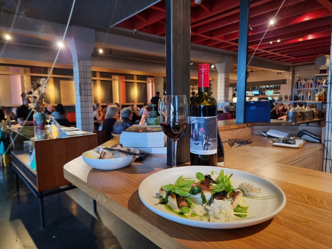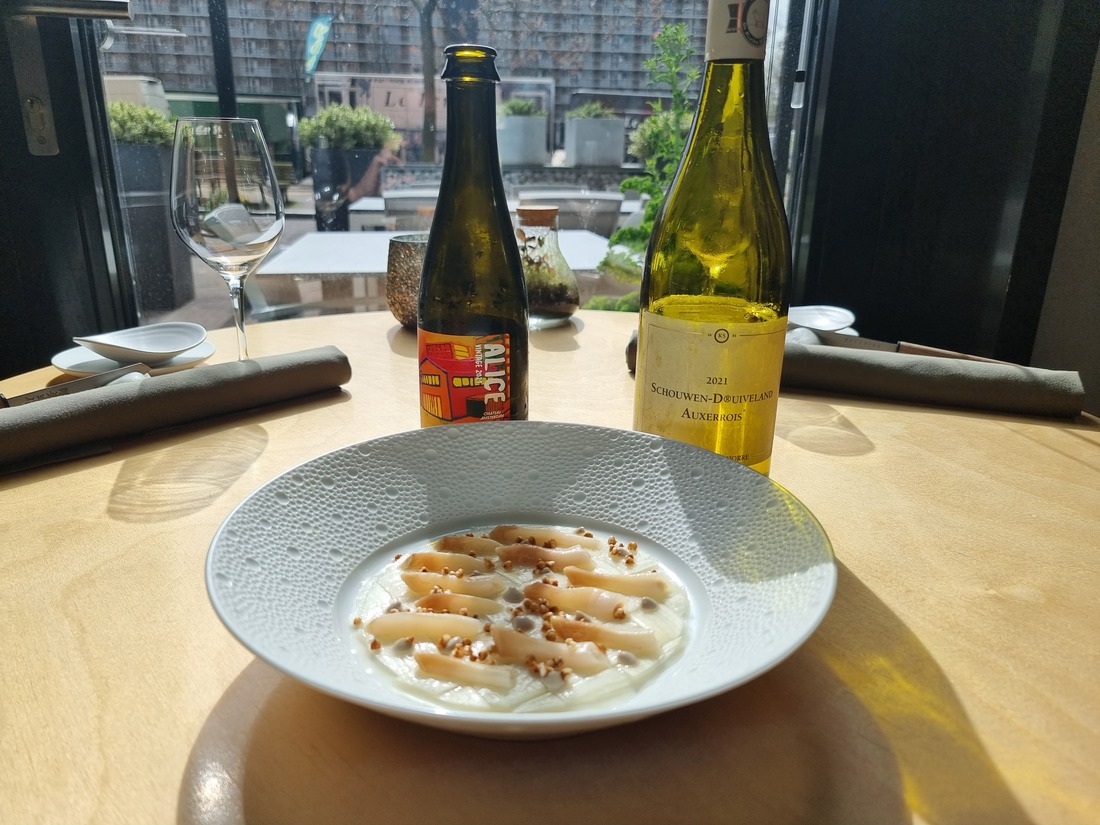 Even een uitstapje buiten de ring naar de favoriete bestemming van veel Amsterdammers te weten Haarlem. Bij ML lijkt de wijn die sommelier Tim Jesse serveert misschien een standaard wijn voor bij de asperges. Maar niks is minder waar. De volledig biodynamische Pinot Gris van Marc Tempe uit de Elzas werkt heel mooi met de soja in het gerecht van asperges, knolselderij en in tempurabeslag gebakken cordycepes, een paddestoel uit Azië. Het voegt een vegetale toets toe aan het gerecht terwijl het kleine zoetje in de wijn perfect matched met het licht zoete van de asperge en de knolselderij.
