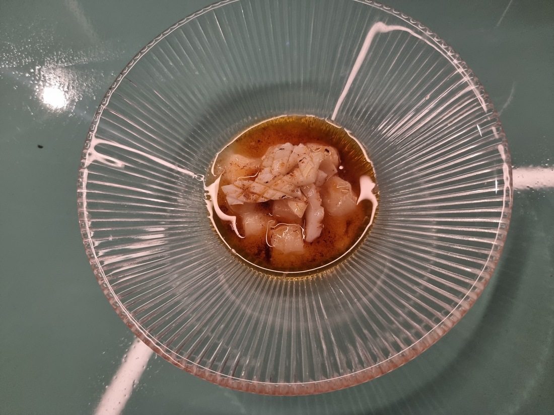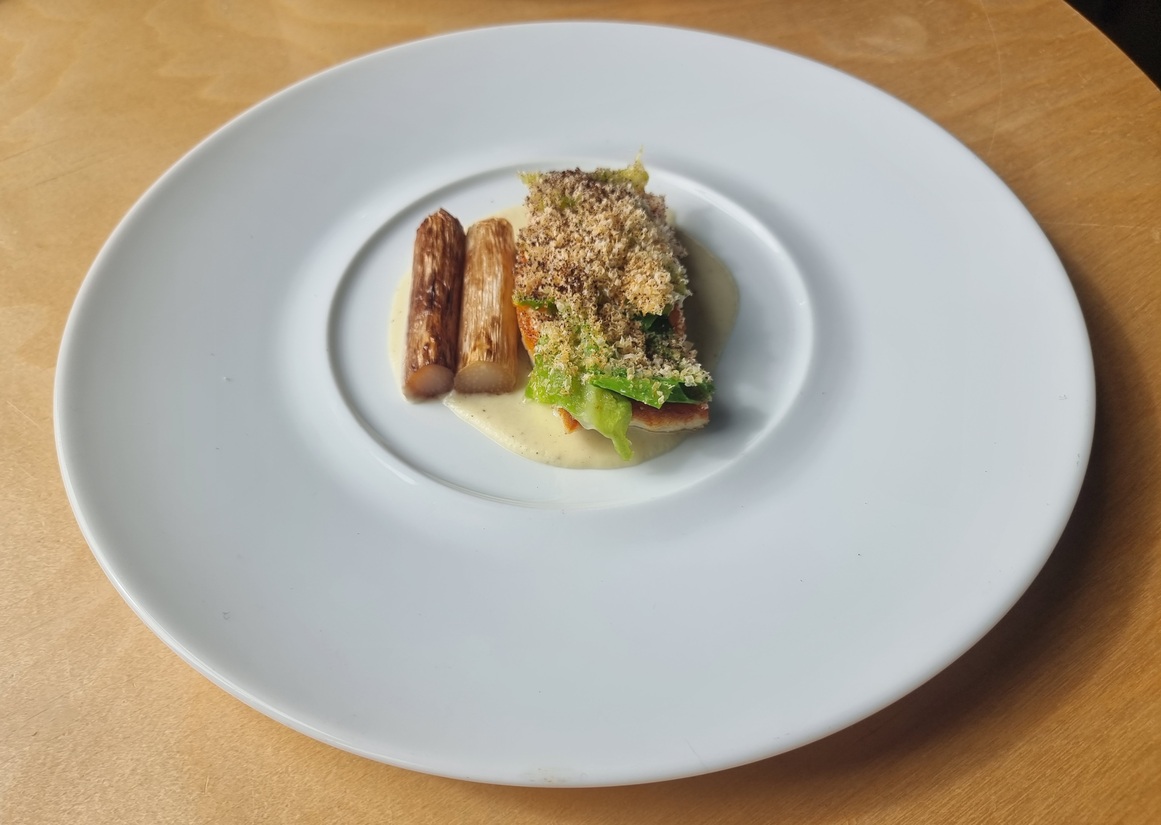 Het ultieme comfortfood gerecht met asperges is de derde gang in het huidige menu bij Restaurant Europa. Gesneden in stukjes van een centimeter of twee licht gegaarde stukjes asperges in een rijke bouillon met ruim boter en een klein pitje met gegrilde stukjes inktvis. Echt een top gerecht waarbij alle ingrediënten compleet in balans zijn. Daarbij kozen wij een natuurlijke witte wijn uit de Savoie, de Franse streek bij Zwitserland, Ca Boit Libre. Leuke naam, zeker met de hoge wijnprijzen bij Europa. De wijn is gemaakt van de druif chasselas en heeft een hele lichte oranjegloed maar combineert echt fantastisch bij het romige en tintje pittigheid van het gerecht.
