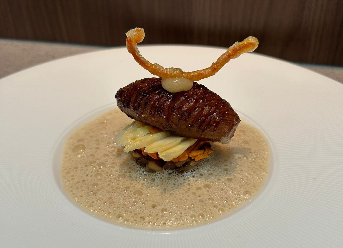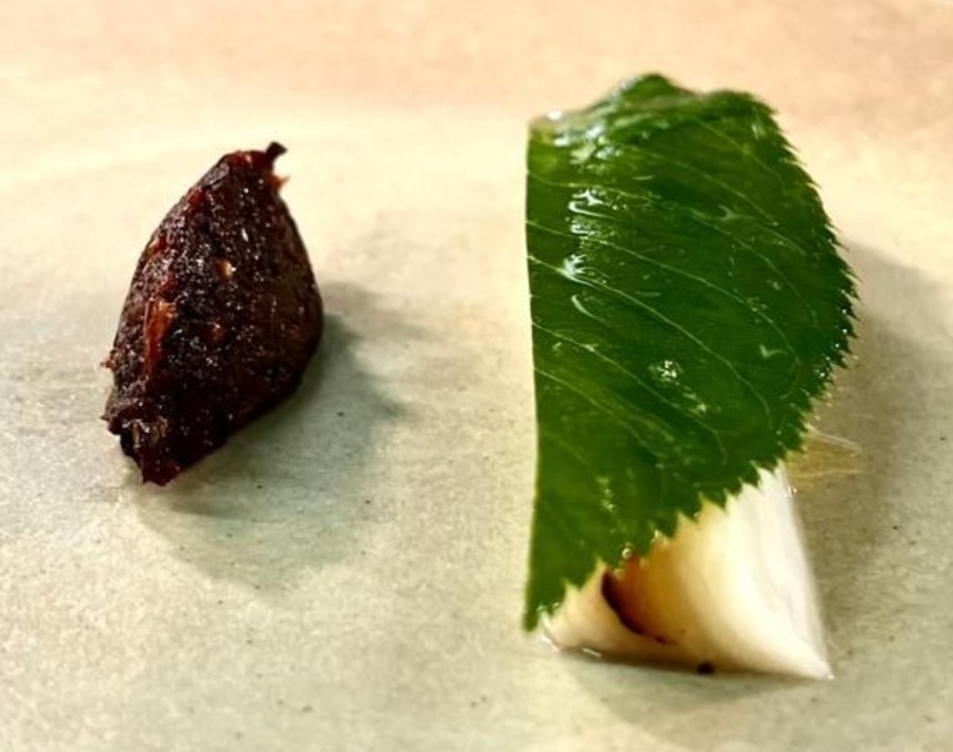 Bij Flore staat een gerecht van witte asperges met koolrabi condiment, gewikkeld in sakurablad met een hollandaise van getoastte gist op het menu. Sakura is een Japanse kersenboom, de bladeren geven een licht zoutige smaak met nog steeds een klein beetje kers en wat aroma’s van tonkaboon (beetje vanille-achtig). Hierbij schenkt sommelier Antonello Nicastri de Suavia Le Rive, uit Veneto gemaakt van de lokale druif garganega. ‘De wijn is elegant en heeft de mineraliteit die past bij de kruidigheid van het gerecht en een lichte bloemige ondertoon die de smaken van de sakura weerspiegelen’, zo verklaart bij.