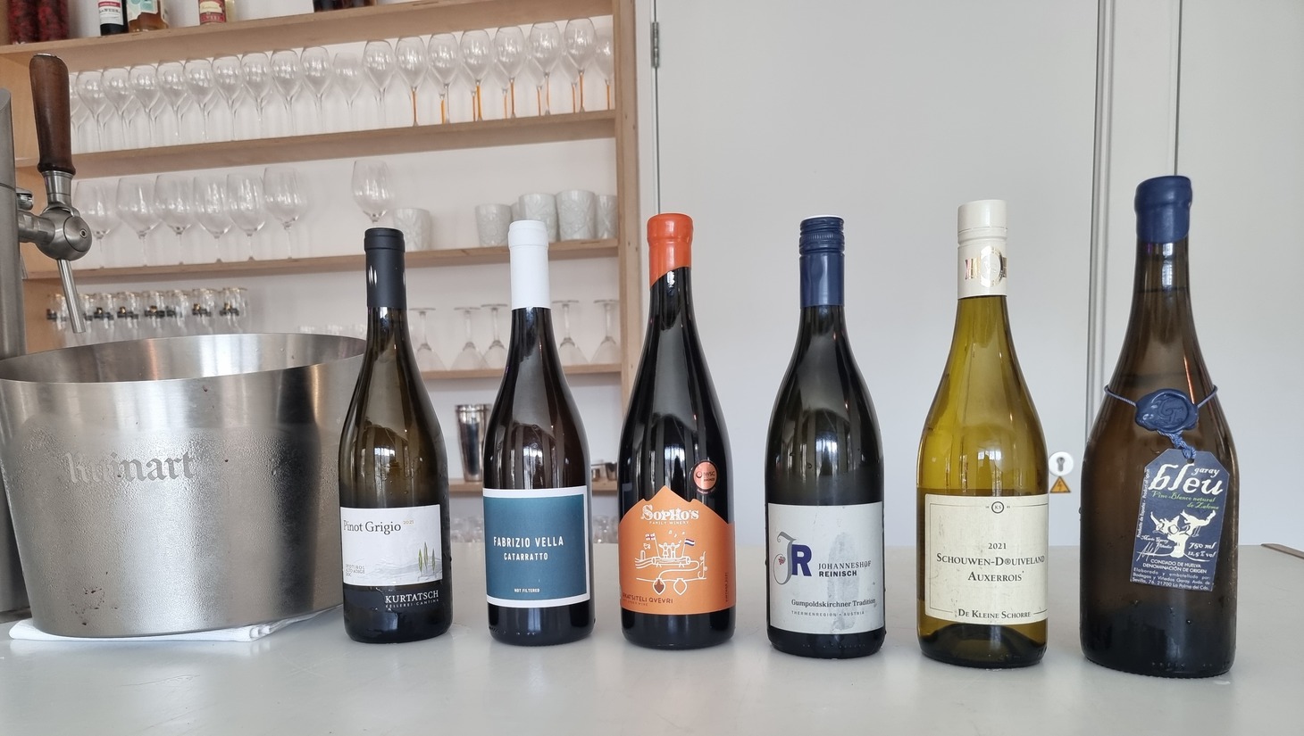 Gecombineerd met de asperges werden de volgende wijnen geproefd; Sopho’s, een amberwijn gemaakt door een Nederlands-Georgisch echtpaar in Georgie, een ongefilterde catarrato van Fabrizio Vella uit Sicilië, de Pinot Grigio van Kurtasch uit Noord-Italië, een Oostenrijkse wijn met een klein zoetje van Johanneshof Reinisch, De Zeelandse Kleine Schorre en de natuurlijke Garay Bleu gemaakt van de onbekende druif zalema uit Huelva in Spanje. De conclusie was dat complexere gerechten met asperges ook complexere wijnen nodig hebben. Zo deden de Garay, Sopho’s en catarrato uit Sicilië het erg goed met het gerecht met tarbot en koffie en De Kleine Schorre en de Pinot Grigio het beter met het aspergegerecht met scheermes en ansjovis. Grappig is dat de enige wijn met een zoetje, van Johanneshof Reinisch heel goed combineerde met beide gerechten.