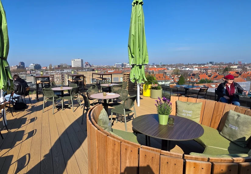 Het dakterras van Hotel Casa heeft dit voorjaar een complete make-over gehad. De studenten-achtige look is een beetje geüpgraded. Met deels een slimme overkapping zodat je bij het soms nog onzekere voor- en najaar altijd droog kunt zitten. Ook de zitjes en de kaart hebben een upgrade gehad. Leukste plek is misschien wel de ronde bank midden op het dakterras.
