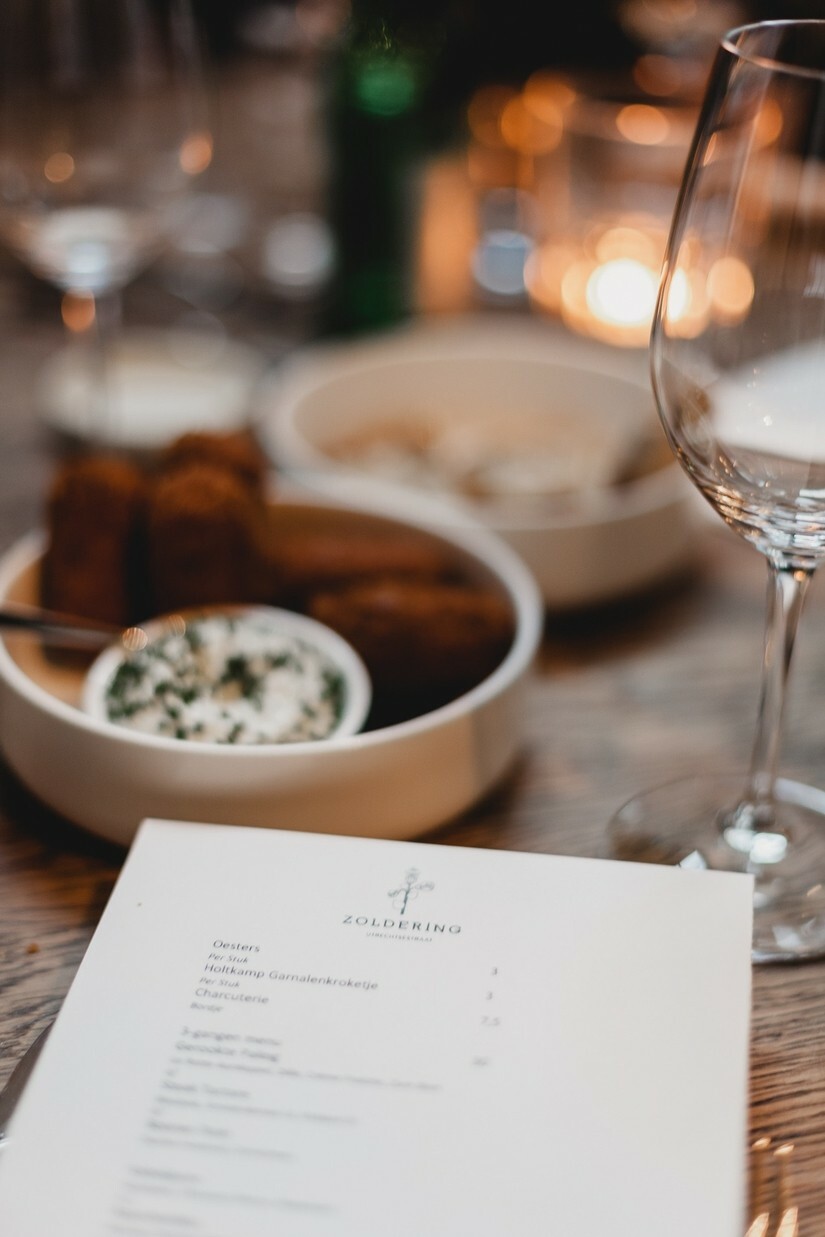 Bij Zoldering is een uitgebreide wijnkaart en je kunt er borrelen en dineren. Er zijn geen voor- en hoofdgerechten, je kunt hier eten waar je zin in hebt. De mannen van Zoldering – Tomas Bron, Wout Jans, Job Seuren en Joost Clarijs – zijn zeker geen onbekenden in de horeca-wereld. Tomas heeft onder andere in de keuken gewerkt bij Librije en als souschef bij Goldfinch Brasserie. Wout heeft ruim acht jaar bij Ciel Bleu gewerkt als sommelier en ook Job werkte als sommelier en bedrijfsleider bij onder andere De Librije en De Klepel.