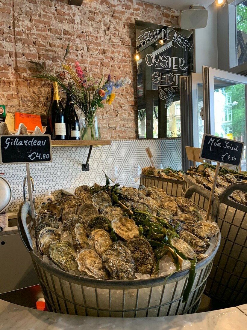 In de vitrine van The Seafood Bar is er de keuze uit twee soorten oesters, die allebei per zes stuks worden geserveerd. De Fines de Claire Juizette la Reveuse (€17,50) heeft een hoog vochtgehalte en een fijne zilte smaak, door het rijpingsproces in de Claires. De Gillardeau (€29,00) is kruidig en zacht zilt, maar heeft ook een zoetje, is fruitig en bevat tonen van hazelnootaroma.