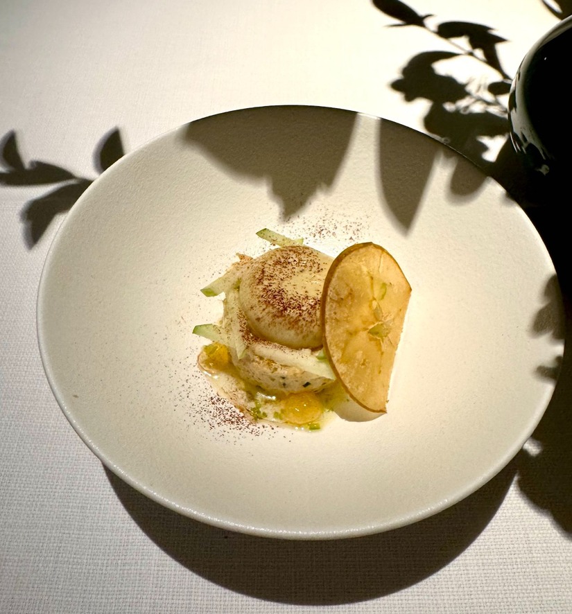Vervolgens werden we in de watten gelegd met een selectie van de gerechten die tijdens de feestdagen op het menu staan. We gaan van start met de krabsalade met eendenlever en appel, lekker fris, maar ook mooi rijk van smaak. Vervolgens werden we verrast met een feestelijke tafelbereiding van coquilles uit de schelp, geserveerd met wintergroenten en truffeljus. Als hoofdgerecht proeven we van een mooi stukje eendenborst, met een kleine eendenwellington en pompoen. Om af te sluiten serveert het team ons het oud & nieuw dessert met Champagne, witte chocolade en duindoornbes.