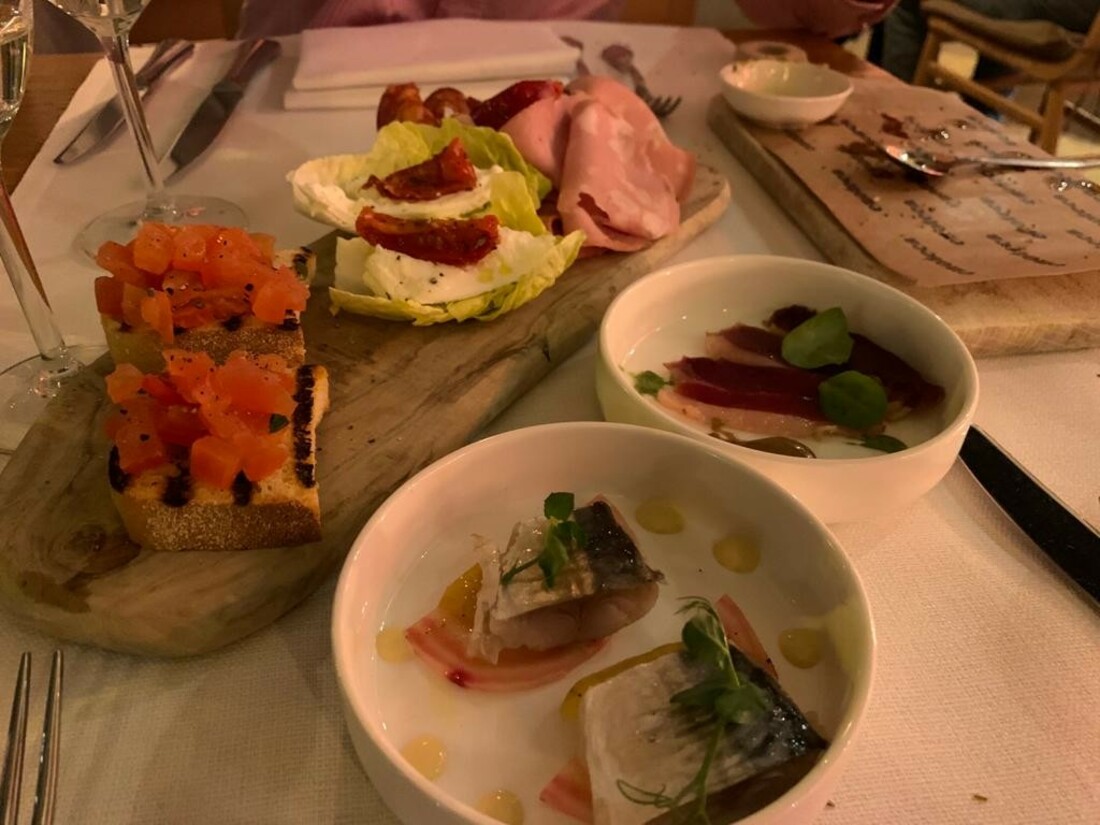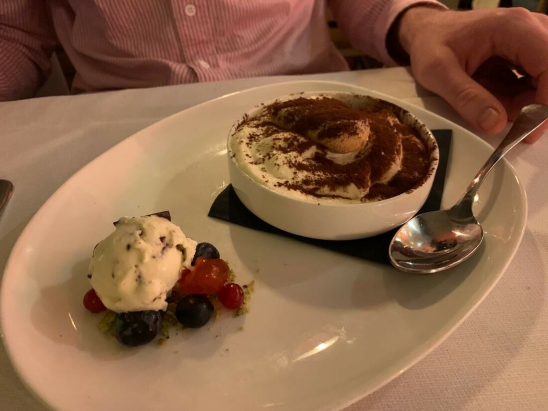 Terug naar het eten. Na een goed glas prosecco en de heerlijke focaccia die we op tafel krijgen met olijfolie, beginnen we met een proeverij van antipasti. Favoriete op de plank zijn de buffel mozzarella geserveerd in knapperige romaine sla en de kwaliteitsvleeswaren met als topper: huisgemaakte prosciutto van eendenborst. Door naar de primi, want we zijn erg benieuwd naar de huisgemaakte pasta’s! De vriendelijke gastheer raadt ons de Tagliolini al tartufo aan. Deze keuze levert ons geen spijt op: verse pasta in een rijke Parmezaanse kaas en botersaus met zwarte truffel. Comfort food met een hoofdletter C. Verder proberen we de ravioli gevuld met pompoen en mascarpone, geserveerd met salie, en een grappige twist: amaretti koekjes, heerlijk. Ook mogen we het timbaaltje van polenta met bospaddenstoelen en ‘kaasfondue’ proberen, een prachtig gerechtje om te zien. Als dolci bestellen we, uiteraard, tiramisu geserveerd met stracciatella ijs. Hiervan hebben wel eens betere versies geproefd. Ons andere dessert, de warme gezouten karamel soufflé met vanille ijs is fantastisch. We sluiten helemaal voldaan en tevreden af met de huisgemaakte limoncello.