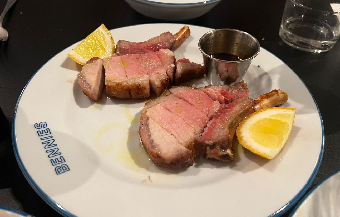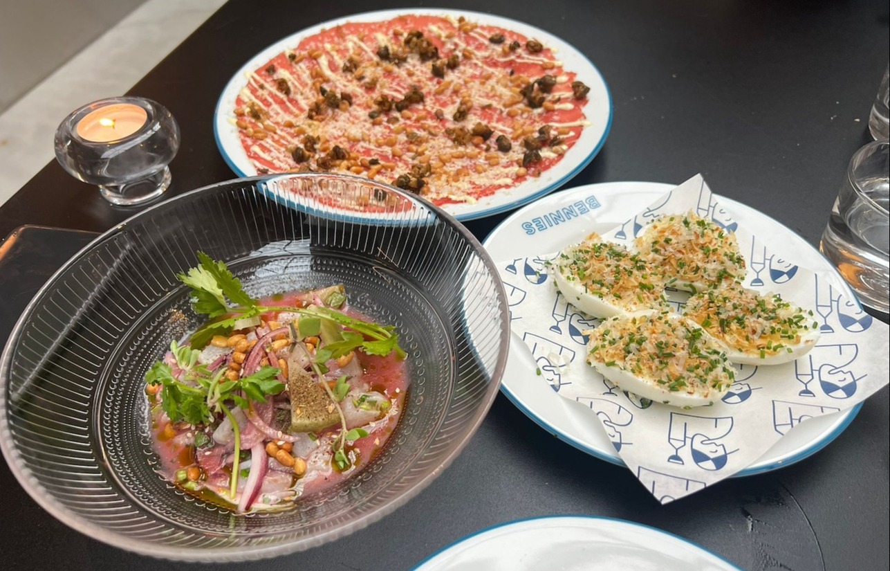 Brood van Wolf met luchtig geklopte citroenboter, ceviche van zeebaars met granaatappel en gevulde eitjes met Jalapeño. En carpaccio. Vers en iets dikker gesneden. Een gang die in Amsterdam wellicht wat uit de tijd is geraakt, maar bij Bennies juist daarom een plekje op kaart lijkt te hebben gekregen.