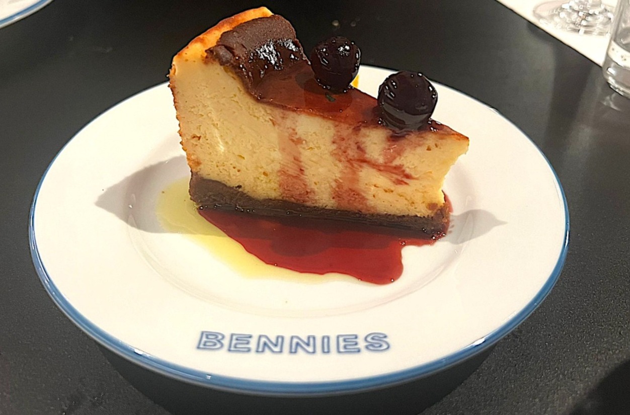 Als hoofd proeven we ‘Côte du Porc’, oftewel ribstuk van de BBQ van Iberisch Varken. Zie je tegenwoordig niet heel vaak op het menu staan. Zonde, want een karbonade op deze wijze is een ongelofelijk lekker stukje vlees. Mals en supersmaakvol met een mooie vetrandjes. De diep ingekookte kippenjus die er wordt bij geserveerd maakt van elk stukje een snoepje. Op aanraden delen we als dessert een gebrande cheesecake met ingelegde zure kers.