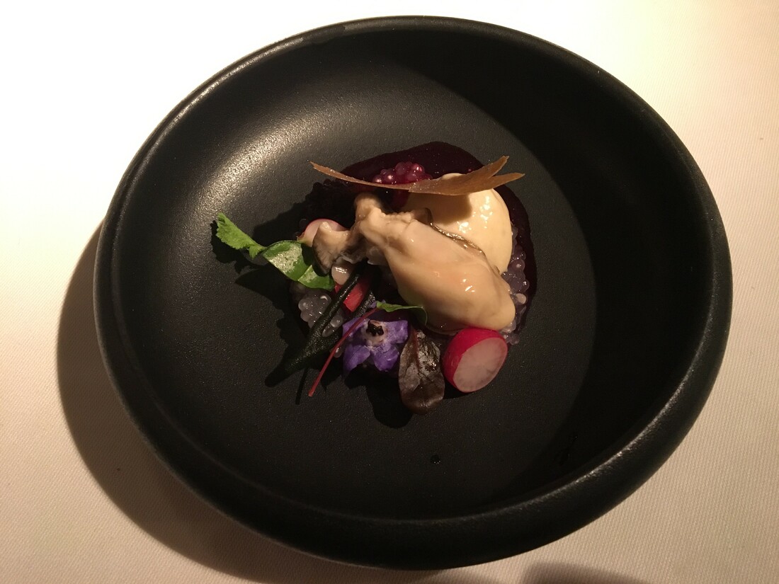 De toon is hiermee gezet. Na de amuses volgt een flan van gerookte sprot. Een romige mousse van vis met hierop een stukje haring, haringkuit en een Amsterdams uitje. Romig, knapperig, zuur, allerlei smaken zijn hierin terug te vinden. Een perfect begin van het menu. Ook de oester, die vervolgens wordt geserveerd, heeft een verrassend effect. De rode wijnazijn heeft plaatsgemaakt voor rode bietensap. Het sap wordt aan tafel op je bord gegoten en is goed geconcentreerd. Daarnaast liggen er prachtige eetbare bloemen bij. Het gerecht is net een schilderijtje van Monet.
