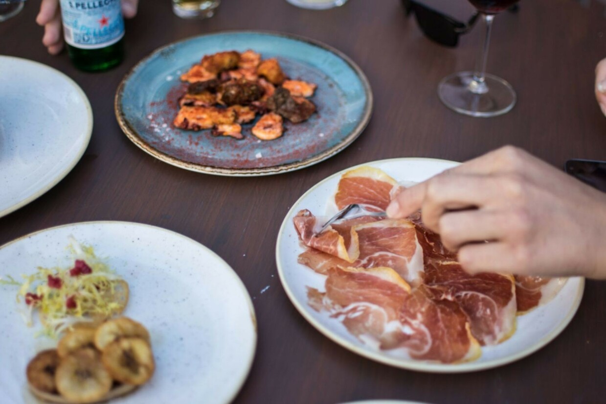 We bestellen speciaalbiertjes van Brouwerij ’t IJ, een IJwit en een IPA. Als we een blik op de kaart werpen krijgen we spontaan keuzestress. Het idee bij Escobar is dat je verschillende gerechtjes bestelt en die met elkaar deelt. De kleine bordjes die al op tafel staan, verraden dit een beetje. De gastheer, die zich voorstelt als Roderick, ziet de keuzestress op onze gezichten en stelt ons gerust. We geven door wat we niet willen eten en voor de rest laten we ons verrassen.