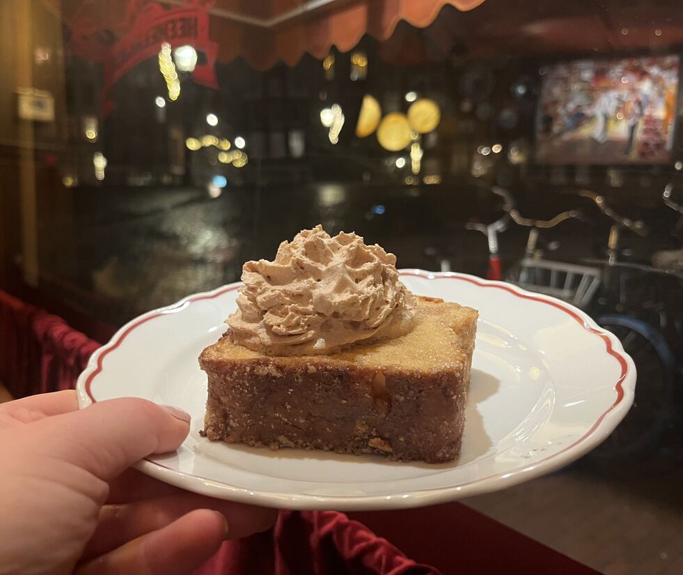Ondertussen waren wij een van de laatste die nog in het restaurant zaten en konden we de playlist extra goed horen. “I will always love you” van Whitney Houston galmde door de speakers en het voelde echt even als de gezellige woonkamer van mijn oma waar ik op bezoek was. Het hoogtepunt voor ons was absoluut het toetje. Het ene wentelteefjes was afgetopt met pistache en de ander met kaneelslagroom. Genereus gemaakt van Fries suikerbrood en natuurlijk warm geserveerd.