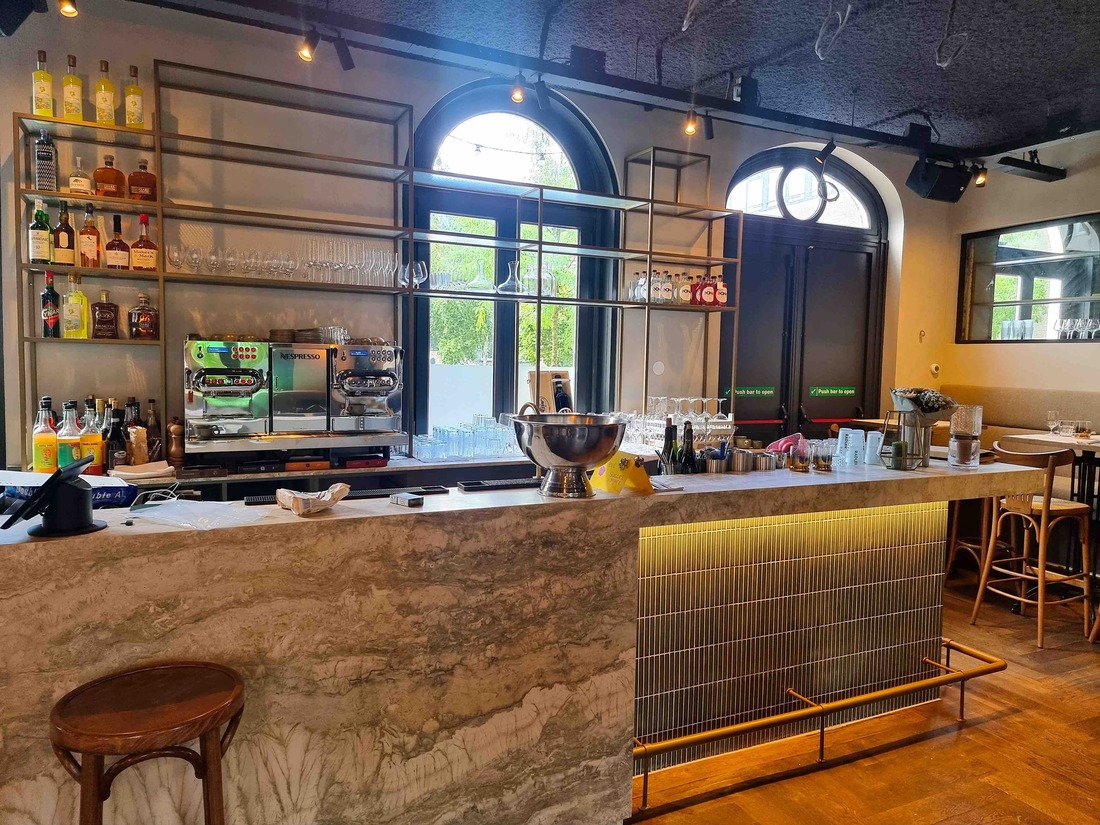 Er is marmer gebruikt bij de bar en rondom de houtoven, maar ook dat is natuurlijk en ingetogen. Daarmee voelt de zaak aan als tijdloos met instant een fijne sfeer. Bovendien heeft het nog een beschut terras aan de voorzijde.