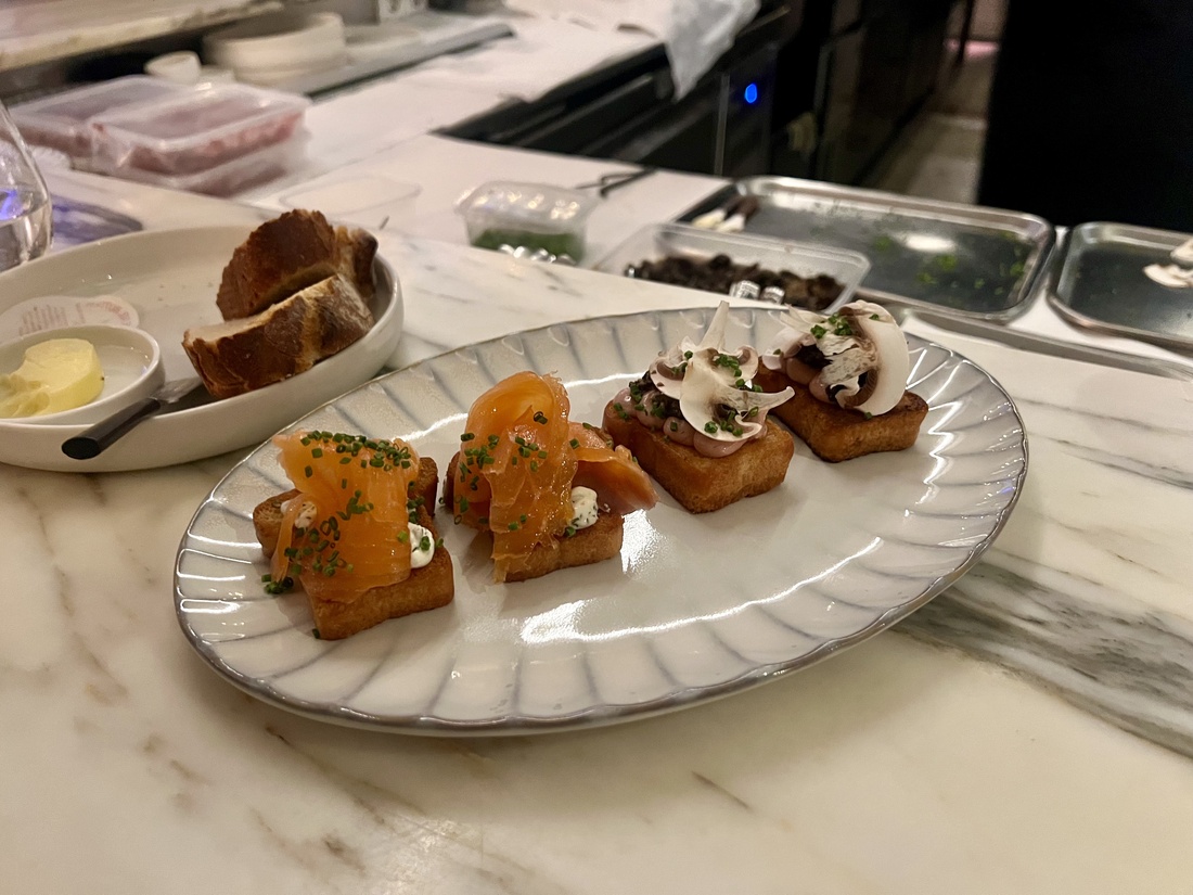 Het is slechts Maart, dus het terras laat nog even op zich wachten. Gelukkig hebben we een tweetje kunnen veroveren op de hoek van de bar. Vaak het leukste plekje van een restaurant en dat is bij Feliné zeker het geval. Dagelijkse keukenchef Luuk Brand bereid hier voor onze neus alvast een aantal snacks waaronder brioche toast met zalm en een versie met kippenleverparfait en morilles. Eenvoudig doch bevredigend.