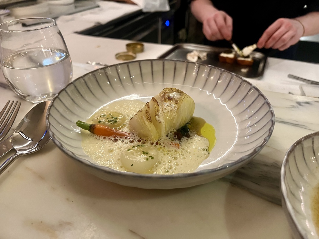 Het menu is weliswaar vernieuwd, naar kent ook een paar oude bekenden voor mensen die eerder bij Daalder hebben gegeten. Zoals de oester met kaviaar, het signature dish van de chef. Om alvast een gevoel te krijgen bij de lente kiezen wij voor een lichtere variant met grapefruit en yuzu.