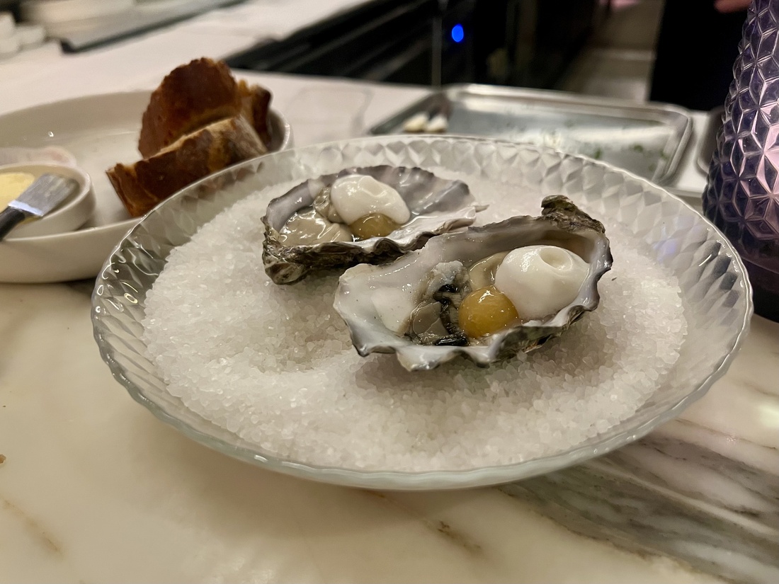 De frisse zuren en het romige van de Irish Mór oester gaan goed met het glas Sylvaner uit Franken die we er bij bestellen. Prima kick-start.