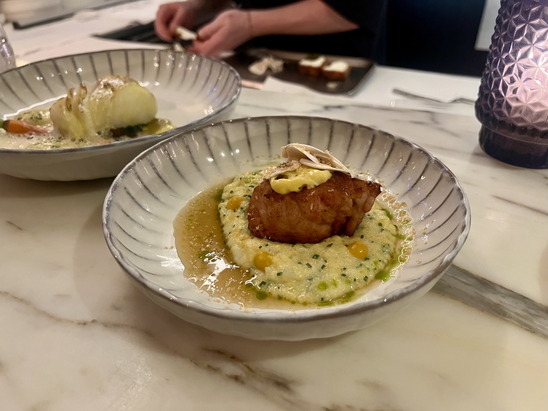 Daarna proeven we drie grotere gerechten. Allereerst de orzo met kreeft en mosseltjes. Mega rijk, mede door de hoeveelheid pasta, dus eentje om te delen. Daarna de skrei. Gekonfijt in curry heeft deze vis een zachtgele kleur gekregen. Mooi en subtiel, maar in het geweld van de overige borden mag het iets meer power hebben.