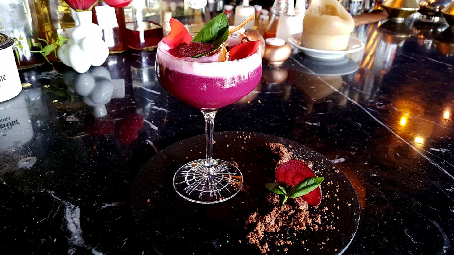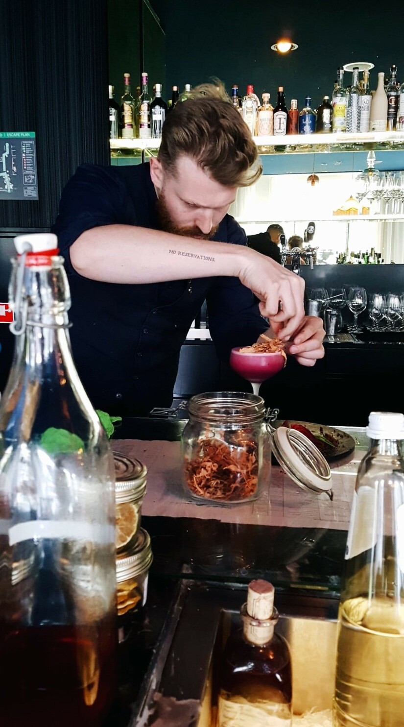 Martin kijkt me strak aan, alsof hij mijn reactie wil peilen, terwijl hij me uit de doeken doet hoe hij elk seizoen in smaken heeft weten om te toveren. De herfst wordt in de cocktail vertegenwoordigd door geïnfuseerde schil van bieten in oranjebloesem en rokerige whisky en bieten- en wortelsap gereduceerd in balsamicoazijn, zout en rozemarijn. Als garnering steken er dunne sprietjes van de schil van wortel en biet uit het glas.