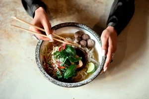 Chef Thuan vertelt dat hij zoveel mogelijk vanuit de basis kookt. “Onze pho (Vietnamese noodlesoep red.) is niet zoals bij de standaard Vietnamezen. De ballen maak ik helemaal zelf en ik kook net zolang door tot alle bouillon getrokken is. Vetsin komt mijn keuken niet in. Het is een e-nummer dat ervoor zorgt dat je na afloop veel dorst heb. Ik maak zoveel mogelijk vanuit de basis.”