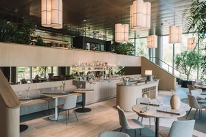 De restaurantruimte is mooi. Laat daar geen misverstand over bestaan. Je komt het restaurant binnen vanaf een verhoging en kijkt zo het restaurant, en via de hoge ramen, de vijver en het park in. Het voelt gelijk internationaal en is heel ruim van opzet. Met veel licht en bewegingsruimte voor het en de gasten. Maar als we eerlijk zijn mist de inrichting de uniciteit van het Dutch Design meubilair en de levendige open keuken die Zuidas wel had. Het heeft nu een meer corporate uitstraling.
