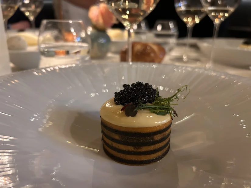 Daarna volgde een zwart-wit cilinder met salade van Noordzeekrab en druif, afgemaakt met een royale dot Oscietra-kaviaar. Daarbij een bijzondere witte wijn van Château d’Issan uit Margaux. Fris en strak, gemaakt van witte Rhône-druiven en dat is best anders en niet toegestaan van de appellatie-politie. Maar juist dat kan met het oog op klimaatverandering interessant zijn voor Bordeaux.