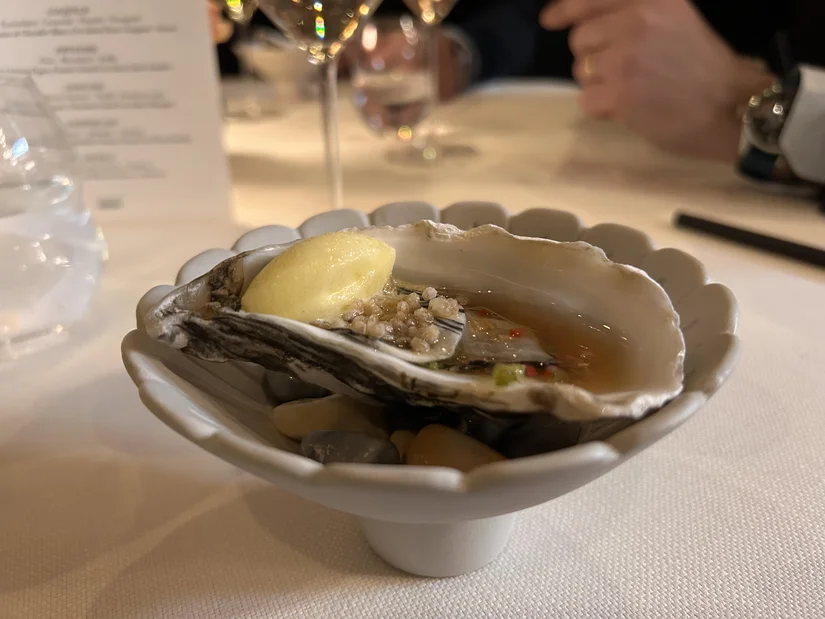 We begonnen met een Champagne Blanc de Blancs van Pierre Péters, geserveerd met een oester. De kalamansi-sorbet en nam jim talay (Thaise dip) maakten het geheel zilt en friszuur.