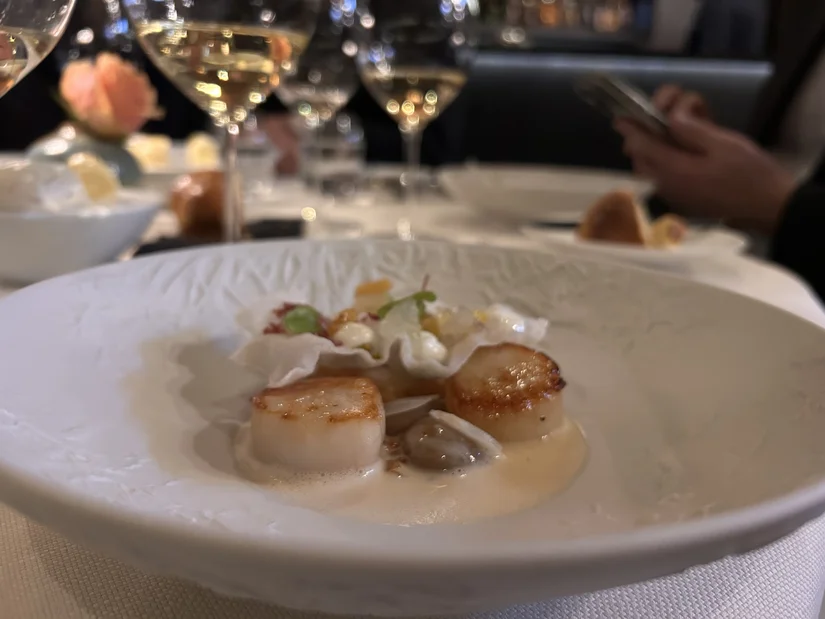 Vervolgens coquilles met knolselderij en guanciale, een zacht, vol en kruidig gerecht. De iconische witte wijn van Domaine Chevalier paste hier perfect bij. De smaken liepen naadloos in elkaar over. Zowel gerecht als wijn dragen het etiket ‘gespierde ballerina’.