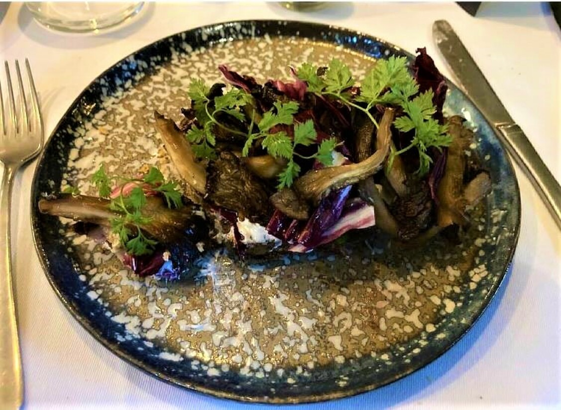 We beginnen ons diner met bruschetta met geitenhangop en oesterzwam en vitello tonnato. Geitenhangop op bruschetta hadden wij nog niet eerder geproefd, maar de frisse hangop combineert goed met de kenmerkende hartigheid van gebakken oesterzwam en de frisse roodlof. De vitello tonnato is zo’n herkenbaar gerecht die zonder al te veel poespas de verwachtingen inlost: flinterdun kalfsvlees wordt geserveerd met romige tonijnmayonaise, kappertjes en ook hier roodlof voor wat extra bite.