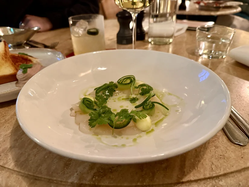 We begonnen met twee heel verschillende voorgerechten. De coquilles waren een heerlijk fris begin, met onder andere appel en komkommer: verfijnd en mooi in balans. Daarnaast kozen we voor de romige parfait du poulet, met een rijke port-chutney. Een simpel klassiek gerecht, maar perfect uitgevoerd.