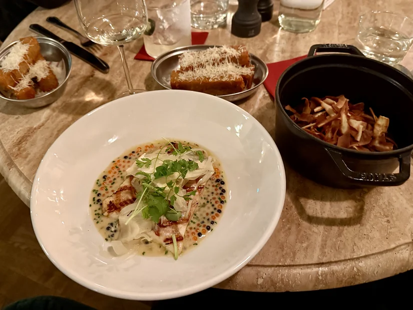 Als bijgerecht kozen we voor krokante aardappel met parmezaan, gelaagd, knapperig en onwijs lekker. Daarbij dronken we de chardonnay die ze per glas schenken, een toegankelijke wijn die bij eigenlijk alles op tafel goed werkte.
