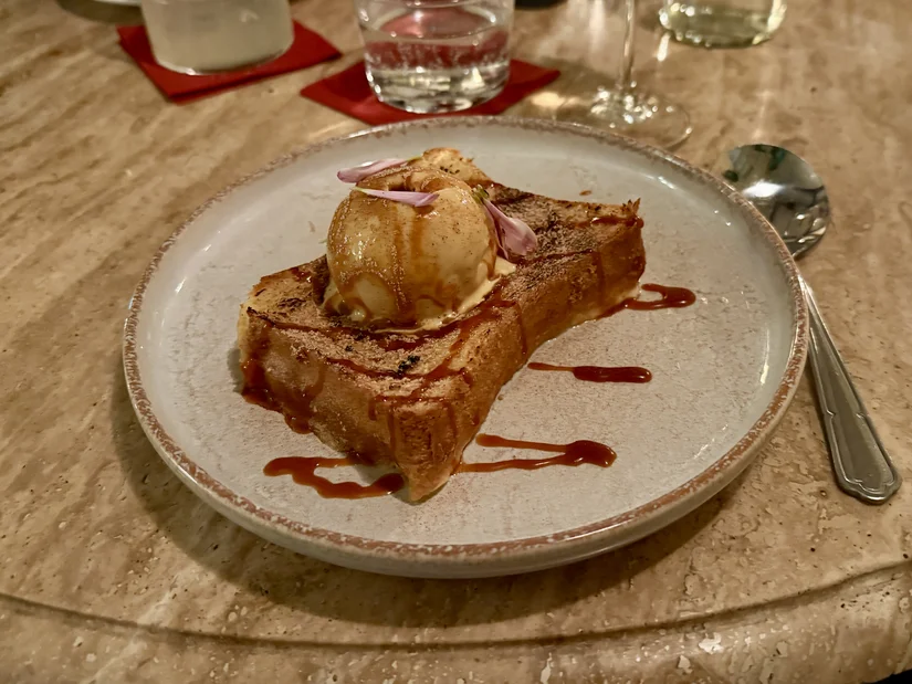 In de wandelgangen hadden we al gehoord dat de brioche perdue een aanrader was, dus die konden we niet overslaan. En terecht: warm, zacht en licht gekaramelliseerd, met vanillesaus en ijs. Precies waar we op hoopten bij dit dessert. Daarnaast kozen we voor de donkere chocolade cremeux met een gel van zwarte olijven: uitgesproken, mooi in balans en niet te zwaar, ondanks de diepe chocoladesmaken.