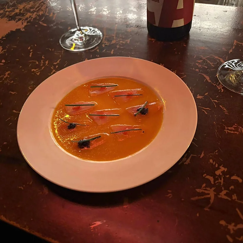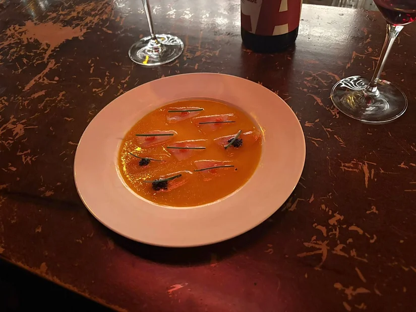 Aanschuiven kan hier voor een borrel (aan de bar), een lange avond tafelen én een dansje tot in de late uurtjes. Wij begonnen aan de bar. Na een warm welkom en het eerste aperitief was het tijd voor happen, met als favoriet de gerookte oester die met de combi van een subtiel zuurtje en een goed beetje beenmergvet zélfs werd gewaardeerd door mijn niet-oester-liefhebbende tafelgenoot. Het bijna-te-mooi-om-op-te-eten bordje rauwe zwaardvis was onze volgende lieveling. Heerlijk ziltig, superzacht en tot aan het lacto-tomatenwater schoon op gedipt met brood.