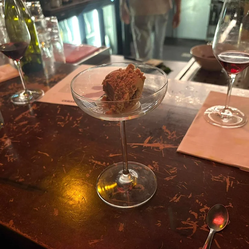 Tijd voor dessert. En hoewel ik geen mega fan ben van zoet, was ik de hele avond al nieuwsgierig naar het kastanje-ijs. Gepoft op het open vuur in eigen keuken en volledig huisgemaakt, was dit de niet-al-te-zoete en daarbij perfecte afsluiter. Pas toen waren we ons ervan bewust dat we de hele avond niet verder gekomen zijn dan de bar en júíst dat mag als een waar compliment gezien worden: bij Camarat blijf je hangen – en dat is precies de bedoeling!