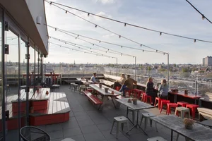 We nemen de lift naar de zevende verdieping, waar we plaatsnemen op het dakterras in de namiddagzon, tussen de bierdrinkende toeristen en Amsterdammers. Het publiek wat op het dakterras zit is te vergelijken met de menukaart: van alles wat. De borrelkaart gaat van bitterballen tot aan een charcuterie met zuur en de drankenkaart is net zo gevarieerd. Wij kiezen de kabeljauwkroketten met citroenmayonaise. Deze knapperige kroketjes zijn in ieder geval een goede start van de avond.