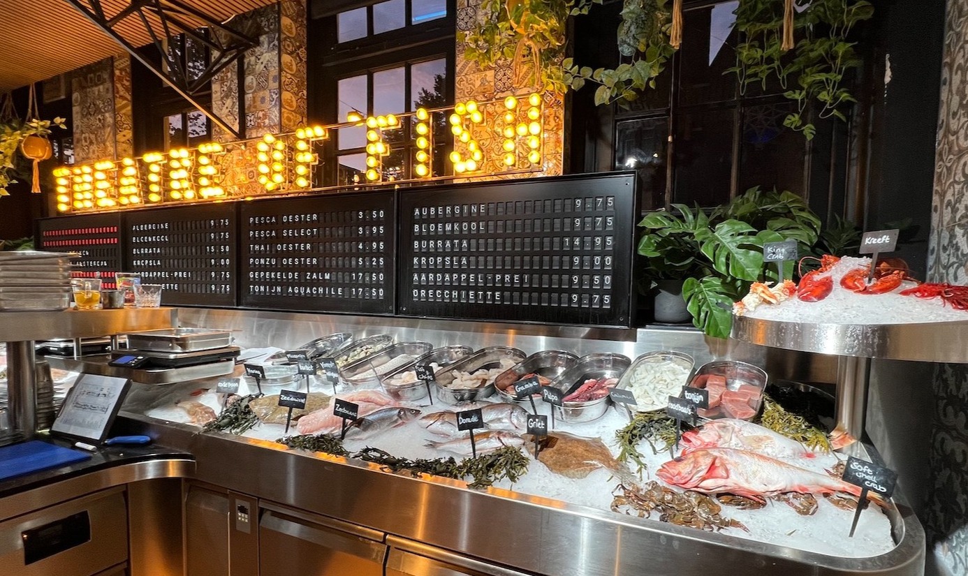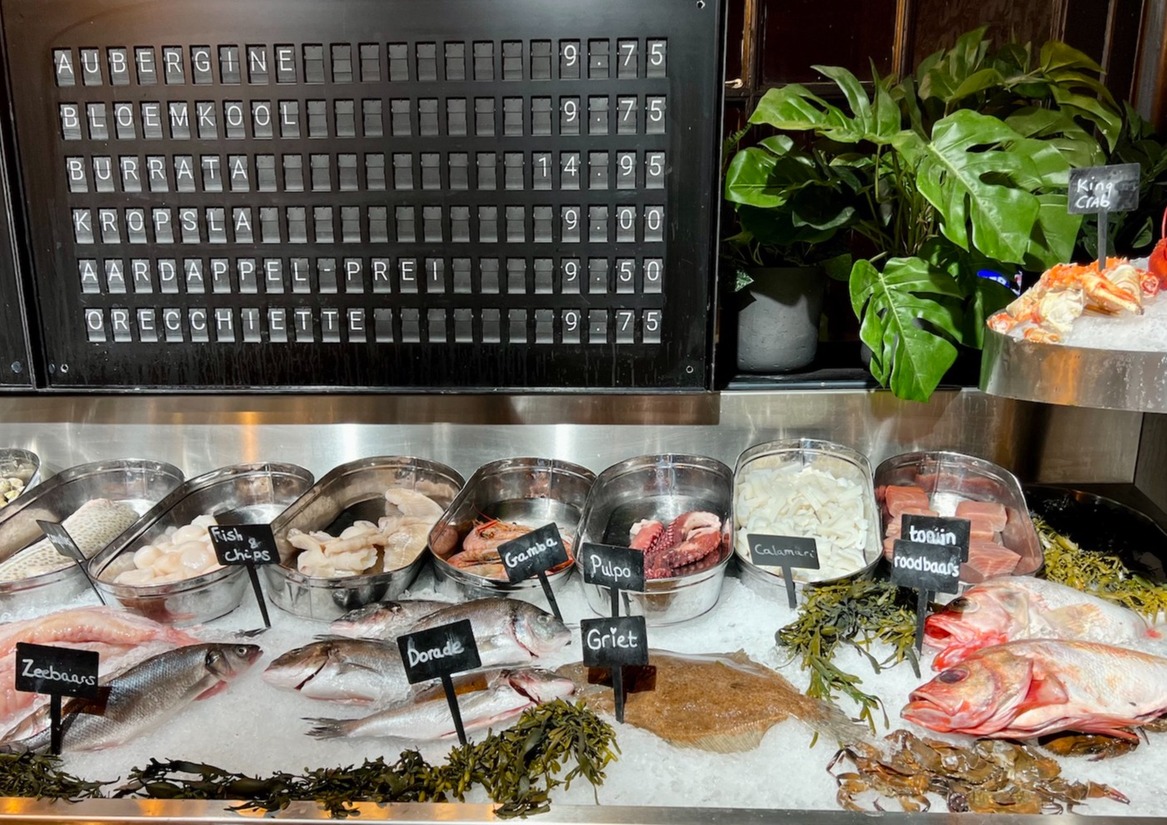 Nog voordat je plaatsneemt, begint de ervaring bij binnenkomst: de vismarkt. Met een glas cava in de hand en een doosje popcorn voor de liefhebber, sta je te wachten tot je mag kiezen uit de mooiste verse vissen en zeevruchten. Geen menukaart, of beter gezegd: de kaart ís de vismarkt. Een lust voor het oog en je maakt je keuzes on the spot waarna het in de keuken wordt bereid.