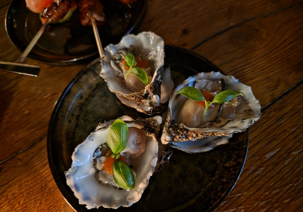 De avond start met drie bordjes: eentje met oesters inclusief een toefje licht spicy aardbeiensaus, gegrild en gemarineerde rundvleesspiesjes met een eigengemaakt barbecuesaus. Mooi begin.